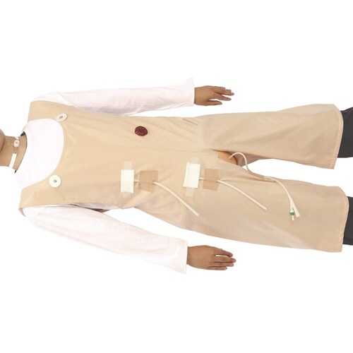 看護学習現場の声にもとに作られた、服の上からでも簡単に着脱できる術後ケア用教材。 |