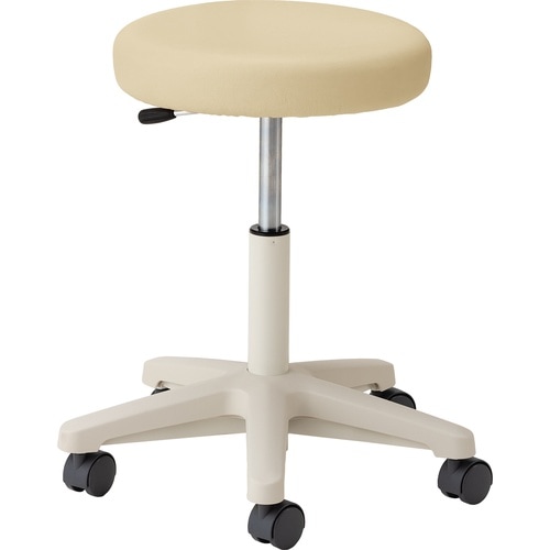 製品サイズ:W510×D510×H465ー625mm・キャスターサイズ:50mm・キャスター仕様:ナイロン双輪・座面寸法:φ375×H465ー625mm・本体重量:6.1kg・材質:座部=ウレタン・スチール、脚部=スチール・ポリプロピレン、張地=ビニールレザー・材質機能:ビニールレザー=耐次亜塩素酸・抗菌・防汚・難燃・個装入数:1台