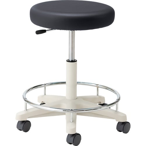 製品サイズ:W510×D510×H465ー625mm・キャスターサイズ:50mm・キャスター仕様:ナイロン双輪・座面寸法:φ375×H465ー625mm・本体重量:6.8kg・材質:座部=ウレタン・スチール、脚部=スチール・ポリプロピレン、張地=ビニールレザー・材質機能:ビニールレザー=耐次亜塩素酸・抗菌・防汚・難燃・個装入数:1台