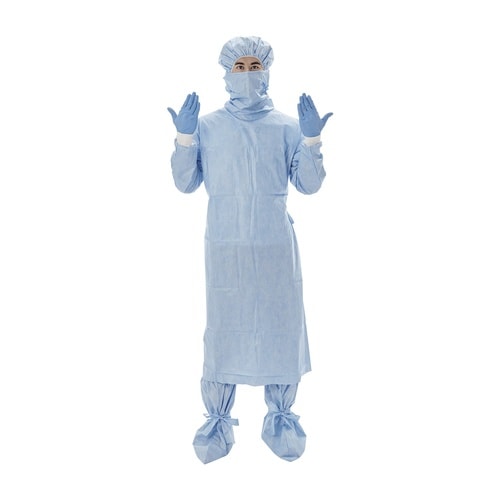 顔の横まで覆うマスクにより首元への飛沫を防ぐことができる感染対策用マスク付ガウンです。人口血液バリア性 クラス6合格(JIS T 8060)。 |