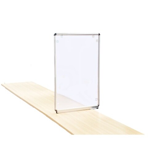 テーブルのサイドに設置(スライド可能)でき、横からの飛沫を防止できます。付属のクランプでテーブルに固定できます。(56.5mmまでのテーブル厚に対応)耐アルコール、耐次亜塩素酸水。