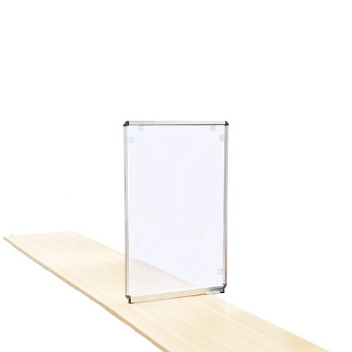 テーブルのサイドに設置(スライド可能)でき、横からの飛沫を防止できます。付属のクランプでテーブルに固定できます。(56.5mmまでのテーブル厚に対応)耐アルコール、耐次亜塩素酸水。