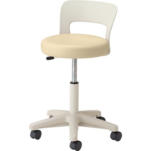 製品サイズ:W510×D510×H670ー830mm・キャスターサイズ:50mm・キャスター仕様:ナイロン双輪・座面寸法:φ375×H465ー625mm・本体重量:8.4kg・材質:背部=ポリプロピレン、座部=ウレタン・スチール、脚部=スチール・ポリプロピレン、張地=ビニールレザー・材質機能:ビニールレザー=耐次亜塩素酸・抗菌・防汚・難燃・個装入数:1台