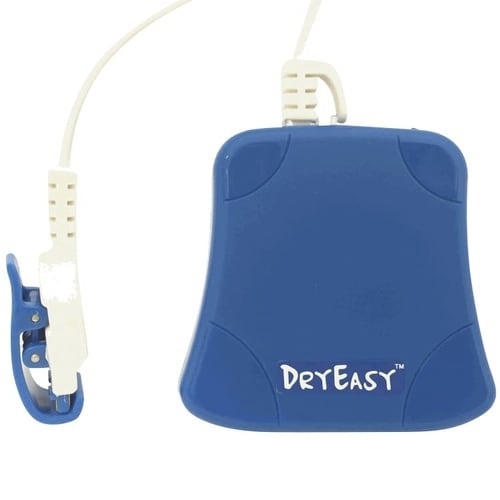 おねしょの濡れを感知した時にアラームでお知らせする装置です。寝る前にパンツの濡れそうなところにクリップ式のセンサーをセットします。 |