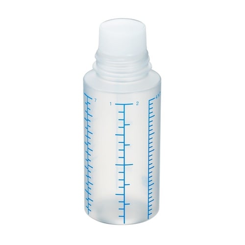 本体の目盛りはどのような色のお薬にも対応可能。MオールMカップは1ccずつの目盛りが付いた15ccまで計量できる薬杯キャップ付。