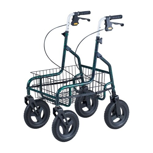 特大かごに25kgまでの荷物をのせることができるので、重たいものやかさばるもの運べる歩行車です。大型タイプは舗装されていない路面やあぜ道などでも使用しやすい10インチのオフロードタイヤです。 |