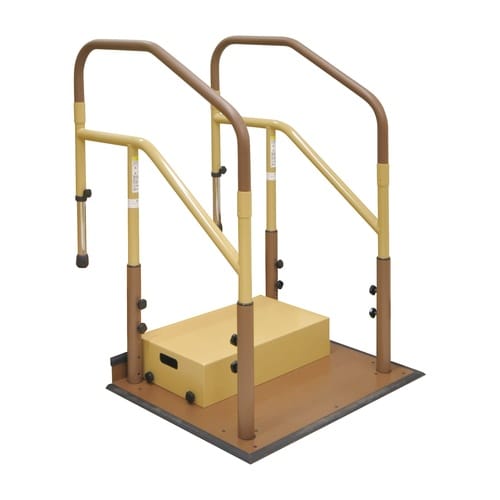 カラー:木目ダーク・製品サイズ:W770×D758×H1060mm・本体重量:41.9kg・材質:手すり=(被膜)ウッドパウダー混合半硬質樹脂(芯材)アルミ、手すりフレーム=スチール焼付塗装、支柱・ベース=スチール焼付塗装、踏み台=スチール焼付塗装・個装入数:1台