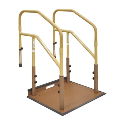 上がりかまちの昇降を安全にサポートします。手すりは握りやすいφ34mm、水平部が長くて安心です。高さは使用される方に合わせて調整可能。ベースプレート表面にはすべり止め加工付です。