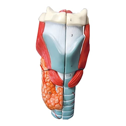 喉頭部から気管およびその周囲の軟骨や筋肉、神経などを2倍の大きさで再現した人体模型。 |
