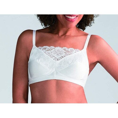 愛らしいレースをふんだんにあしらったキャミソール型の乳がん術後用ブラジャー胸の高い位置まで伸縮素材のレースがきますカップはAAサイズから色はホワイト