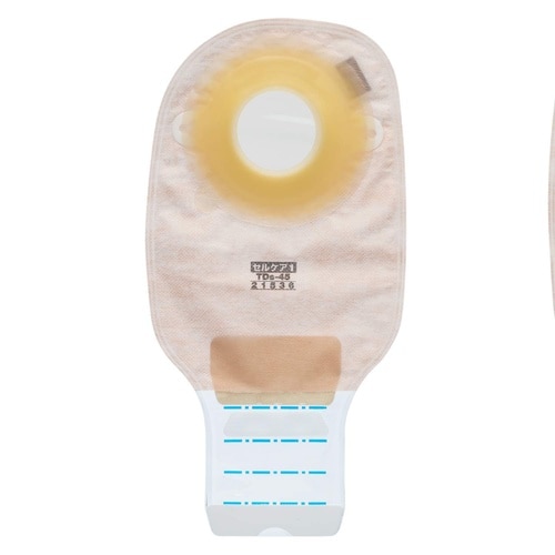 単品系(ワンピース)装具。セラミド配合の皮膚保護剤を全面に使用。面板はセーフティプレート搭載でストーマ周囲皮膚を押さえ、便漏れリスクを低減します。便排出口は固形−軟便に適したクリップレスタイプです。