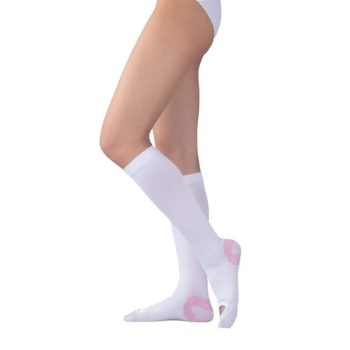 安静時の静脈還流を安全、快適にサポートするハイソックスタイプの弾性ストッキング膝下丈タイプで、下肢や腹部の手術で術野を阻害せず、汚れも気にせず使用可能です。