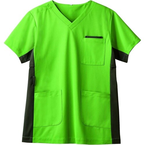 制菌透け防止吸汗速乾制電防汚加工を付与Vゾーンネック仕様の立体裁断で動きやすく、脇下のベンチレーションで快適。