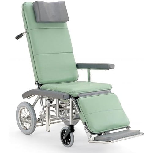 フルリクライニング車いす。バックサポートとフットレッグサポートが連動して動きます。 |