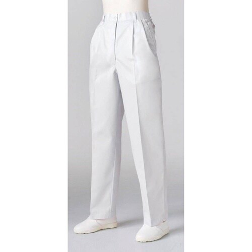 制菌加工が施された、ツータック半ゴムのレディスパンツ。ほこりの付着や着脱時のまとわりつきを防ぐ制電素材使用。 |
