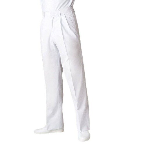 ツータックウエスト半ゴムのメンズパンツ。ほこりの付着や着脱時のまとわりつきを防ぐ制電素材使用。グリーン購入法対象商品。
