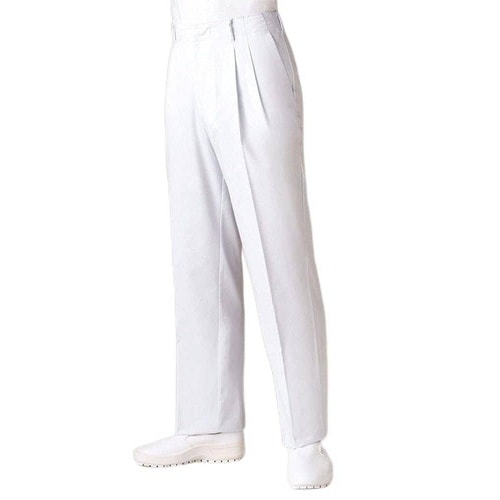 制菌加工が施された、ツータックウエストゴムなしのメンズパンツ。ほこりの付着や着脱時のまとわりつきを防ぐ制電素材使用。