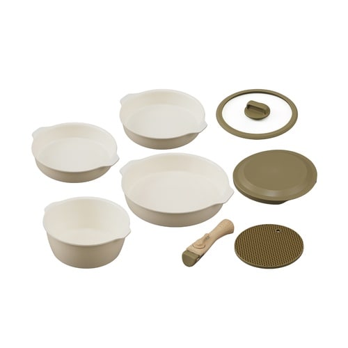 カラー:アイボリー・材質:【フライパン・なべ】表面加工/内側:セラミック塗装加工、外側:焼付塗装加工、材質/本体:アルミニウム合金(底の厚さ3.5mm)、貼り底:ステンレス鋼(クロム16%)(厚さ0.5mm)・【ガラスふた】ふた本体:強化ガラス(全面物理強化)、ゴム部:シリコーン樹脂(耐熱温度250℃)・【PEシールふた】原料樹脂:ポリエチレン(耐熱温度80℃)・【マルチハンドル】樹脂上部:ガラス入りナイロン20%(耐熱温度180℃)、樹脂下部:フェノール樹脂(耐熱温度150℃)、金属部:ステンレス鋼、ゴム部:シリコーンゴム(耐熱温度250℃)・【なべ敷き】材質:シリコーンゴム(耐熱温度250℃)・個装入数:8組・付属品:フライパン20cm2個・26cm、なべ20cm、ガラスふた20cm、PEシールふた20cm、マルチハンドル、なべ敷き