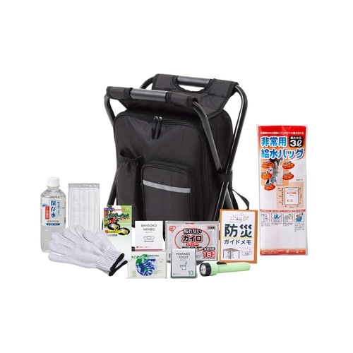 「イス」として避難所や災害時の行列などで活躍する便利なリュックの防災セット。リュックは水をはじく撥水加工素材を使用。