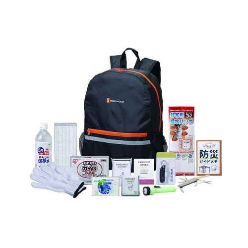 容量:12L・製品サイズ:330×120×400mm・本体重量:1120g・材質:ナイロン、ポリスチレン、ポリプロピレン、鉄、ポリエチレン、不織布、100%再生紙、アルミ蒸着ポリエチレン、鉄粉、水、活性炭、バーミキュライト、塩類、高分子ポリマー、アルミニウム、鉄(ニッケルメッキ)、ナイロン、ABS樹脂、PET、綿、ポリエステル、紙、ステンレス、他・明るさ:30lm・電池の種類:単3X2個・個装入数:1組・構成品:エマージェンシーリュック・BK、蓄光LEDライト、水に流せるポケットティッシュ、静音アルミブランケット、非常用給水バッグ(3L)、携帯トイレ(1回分)、非常用呼子笛(IDカード付)、使い捨てマスク、絆創膏・綿棒セット、保存水(500ml)、軍手、防災ガイドメモ、使い捨てカイロ、八徳ナイフ