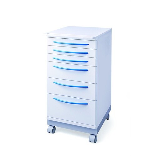 カラー:ブルー・製品サイズ:W400×D480×H800mm・キャスターサイズ:φ50mm・引き出し内寸(1,2,3段目):W340×D340×H35mm・引き出し内寸(4,5段目):W340×D340×H75mm・引き出し内寸(6段目):W340×D340×H155mm・本体重量:50kg・材質:フロント/ボディ:ステンレススチール・トップ:人工大理石・耐荷重:20kg・個装入数:1