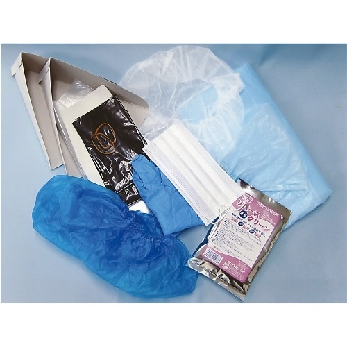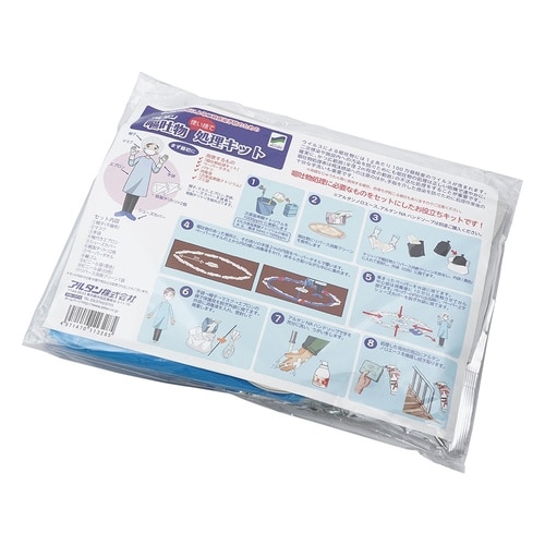 嘔吐物処理作業のために必要な保護具と凝固剤がセットになっています。エッセンシャルオイル配合の凝固剤は嘔吐物にかけるだけで悪臭が消え、静菌効果もあります。 |