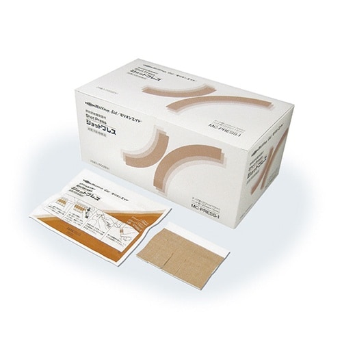 剥離紙に固定用テープがついており、診察台の端に固定できます。より強い圧迫止血が可能です。厚く弾力のあるパッドですので、強い圧迫止血が必要なときに適しています。 |
