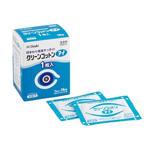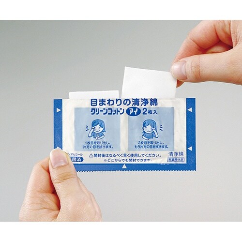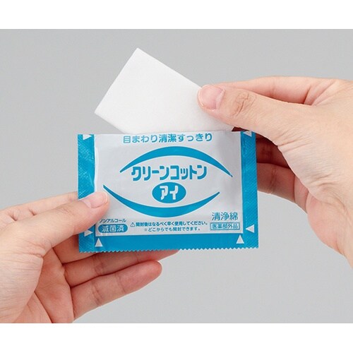 眼科用拭き綿として便利な、単包滅菌済清浄綿です。4方どこからでも開封することができる個包装です。また、脱脂綿を清潔に取り出すことができる位置が強調されています。 |