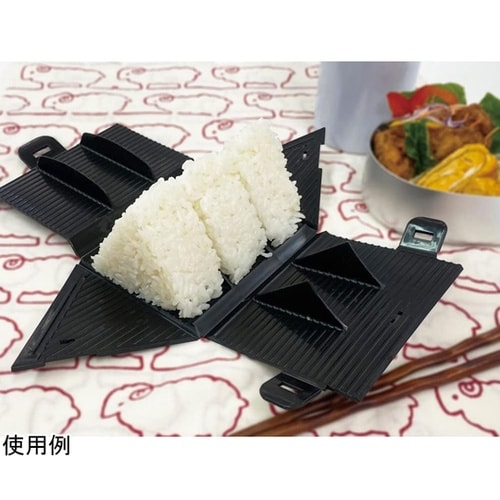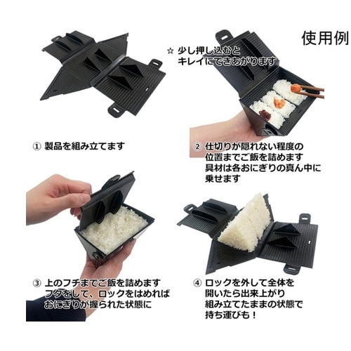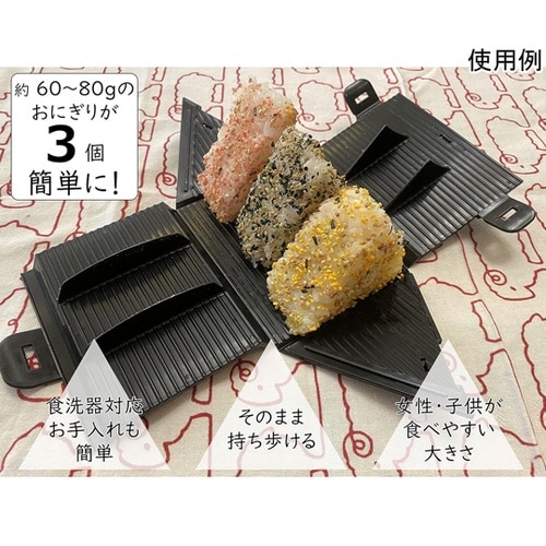 おにぎりを一度に3個作り、そのまま持ち運びが出来ます。60ー80gのサイズのおにぎりが3つ作れます。広げると器の代わりになりますので、運動会、行楽シーズンに大活躍致します。 |