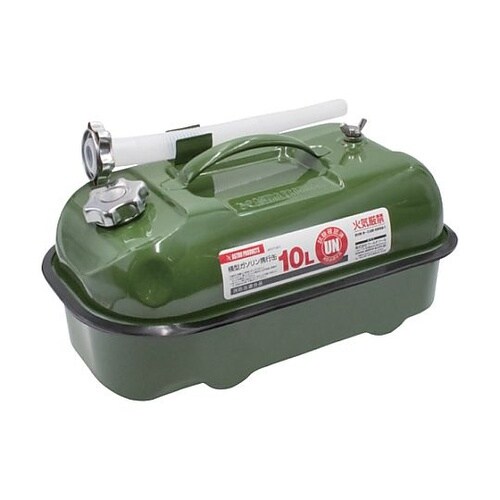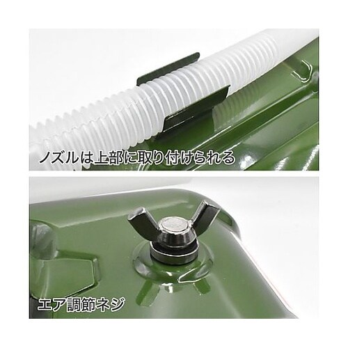 運搬時に倒れにくい横型です。本体底部には持ち手となる窪みがあり、注ぐ際に支えやすくなっています。ガソリンや軽油、灯油の持ち運びに。 |