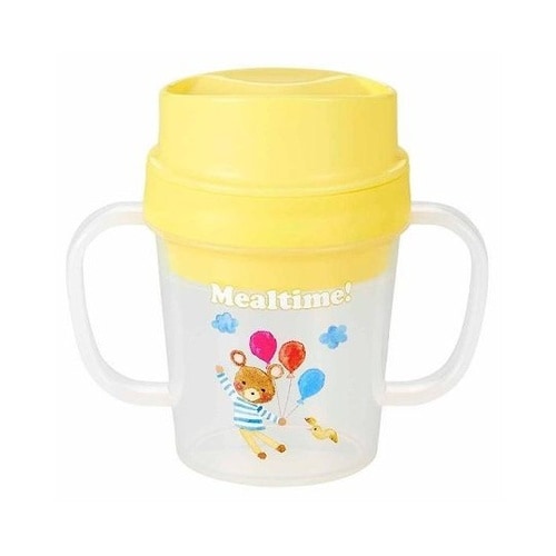 コップが倒れても飲み物がこぼれにくいトレーニングコップです。90度以上傾けると飲むことができるので、自然とアゴをあげるくせがつきます。コップ飲みトレーニングを始められる8ヶ月頃からお使いいただけます。 |