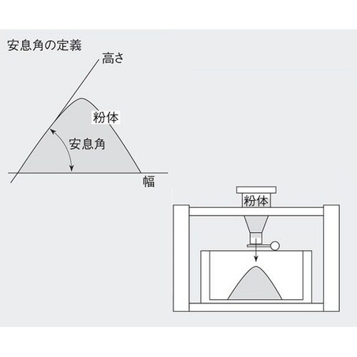 粉体を上方より落下後、下部で堆積した粉末の安息角を分度器で測定します。粉末落下の高さを調節できます。非帯電性の粉末に適しており、簡易測定が可能です。 |