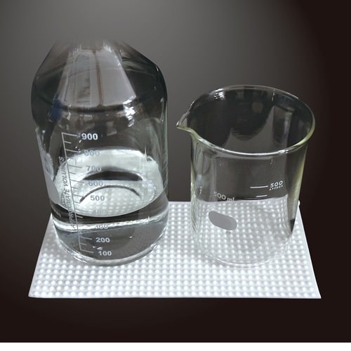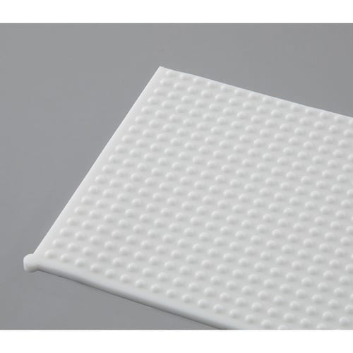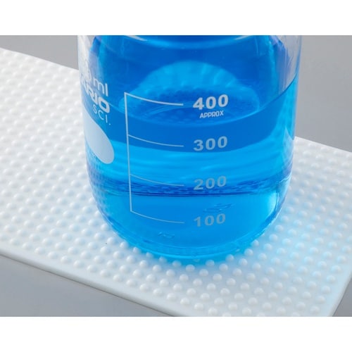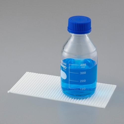 ビーカーや試薬瓶などの下に敷いて転倒を防止するシートです。実験台、作業台、デスク、備品棚等へ貼るだけで容易に設置できます。オリジナル粒形状面が薬品瓶、実験容器に粘着する事で転倒を防止します。 |