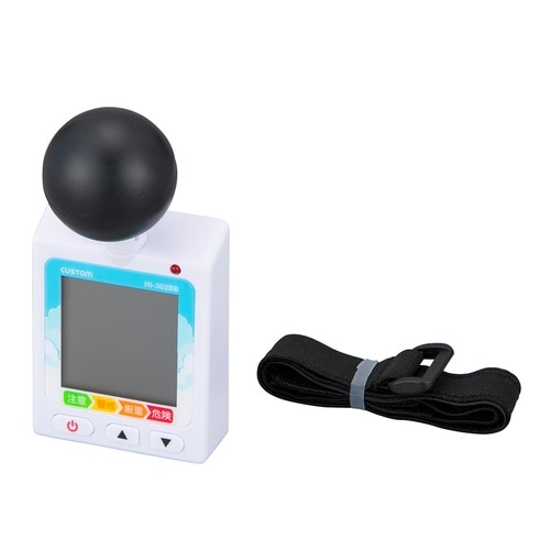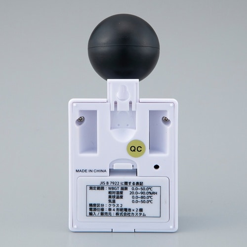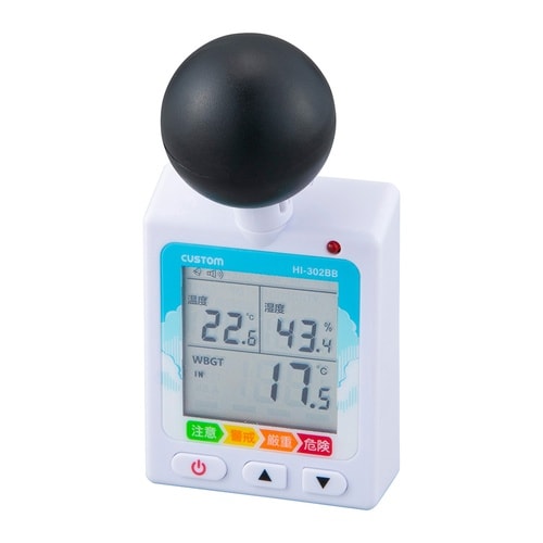 WBGT指数/温度/湿度を一度に確認できる黒球式暑さ指数計です。熱中症危険レベルをアイコンとアラームでお知らせします。WBGT危険レベルアラームの音量と通知のタイミングを任意で設定可能です。 |