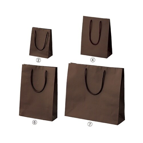 表面がPP貼りで、持ち手にアクリルひも、底部にはボール紙を用いた高級感のあるバッグです。チョコをイメージしたブラウンで落ち着いた雰囲気のバッグ。 |