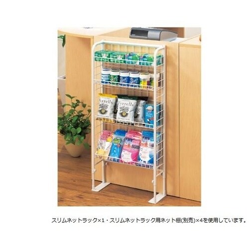 スペースを有効活用できるスリムタイプ。脚部フラットバーの取り付け方向を変えることで、什器の下に差し込めます。レジ前や店頭の省スペースで商品を訴求するのに適した、小型のネットラックです。 |