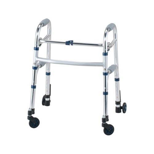 前脚はプラスチックスイングキャスター、後脚はキャスター付ストッパーが付いた室内専用歩行器。グリップ高さが低めの設定で、小柄な方に使いやすいミニタイプです。 |