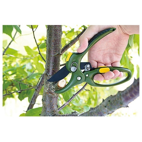 ラチェット式で太い枝もらくらくカット。サビやヤニが付きにくいフッ素コーティングブレード。 |