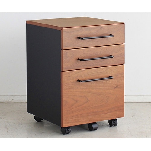 ウォルナット材の優しい色合いと黒のフレームが調和したシンプルなデスク&ワゴン。 |
