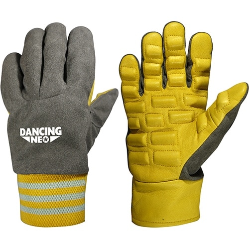 厚手牛本革使用で耐久性があります。振動工具などの作業による振動を軽減し、手を守ります。手のひらに振動吸収材を内蔵しています。振動作業に。カラビナ用のヒモが付いています。 |