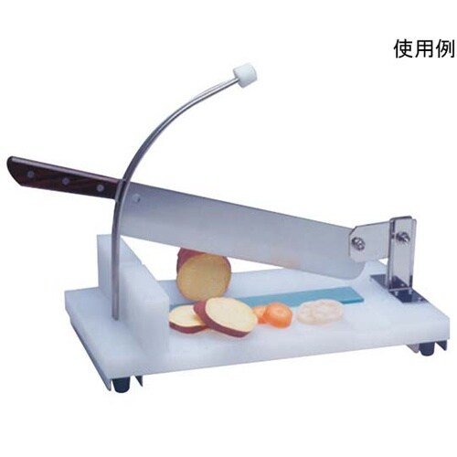てこ式で硬い野菜もカットできます。カット台部分のソフトまな板は傷んできたら交換ができます。1.8mmステンレス鋼包丁従来の機械式スライサーでは切りにくいナナメ切りや厚手のスライスに特に適しています。 |