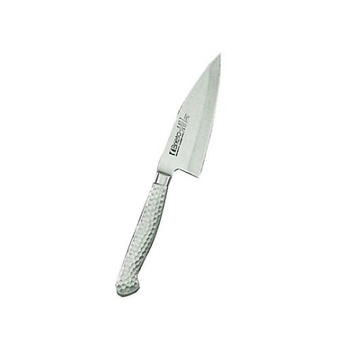 18−8ステンレススチールモナカハンドル。ガラスビーズショット仕上げによる、手触りのソフト化、滑り防止。刃部とハンドル部の(溶接による)一体化で、雑菌等の付着防止など、従来の木ハンドルの衛生面での問題を克服しました。(手研本刃付)