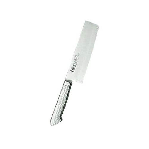 18−8ステンレススチールモナカハンドル。ガラスビーズショット仕上げによる、手触りのソフト化、滑り防止。刃部とハンドル部の(溶接による)一体化で、雑菌等の付着防止など、従来の木ハンドルの衛生面での問題を克服しました。(手研本刃付)