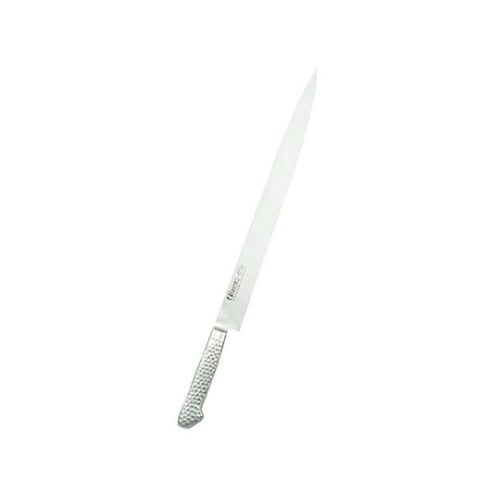 18−8ステンレススチールモナカハンドル。ガラスビーズショット仕上げによる、手触りのソフト化、滑り防止。刃部とハンドル部の(溶接による)一体化で、雑菌等の付着防止など、従来の木ハンドルの衛生面での問題を克服しました。(手研本刃付)