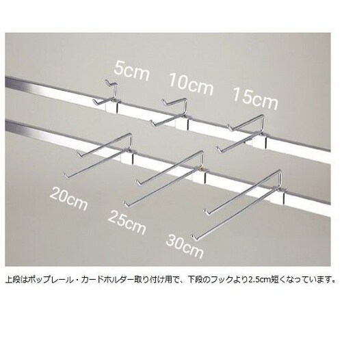 上段はポップレール・カードホルダー取り付け用で、下段のフックより2.5cm短くなっています。 |