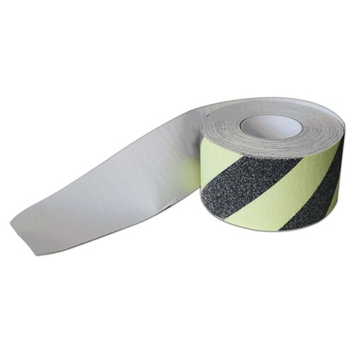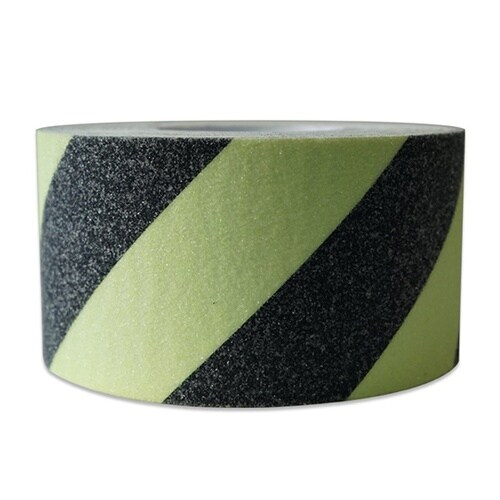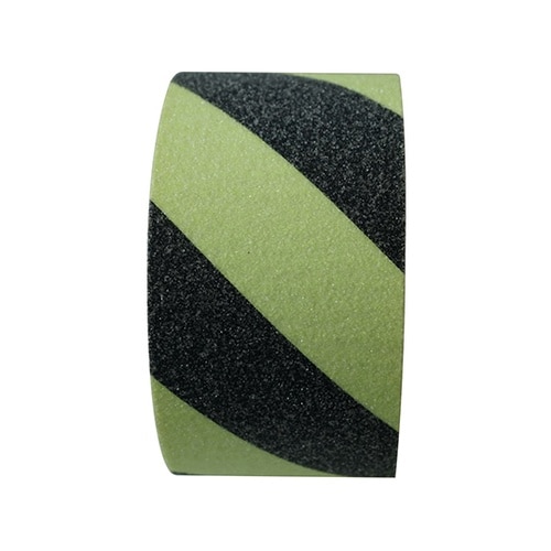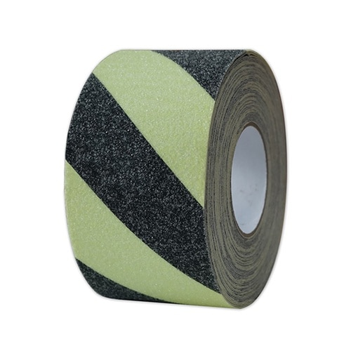 表面に鉱物粒子を吹き付け加工した強力滑り止めテープ。階段、通路などの滑りやすい場所に最適。蓄光タイプで暗所や急な停電時など高い視認性を発揮。 |