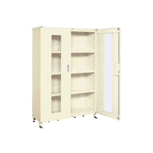 透明窓付扉棚板内形寸法:W1215×D384mm棚板は50mmピッチで段替え可能です。