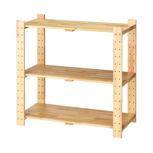 ローコストながら優しい木の風合いが雑貨などの小物陳列を引き立てる木製シェルフ。柱や棚板の木材は、フィンガージョイントで組み合わせた集成材を使用しているので、継目は見えますが、強度はバツグンです。 |
