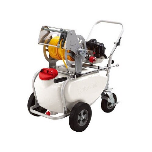 50Lタンク・キャリー付で持ち運びが簡単です。直射で4m以上飛び、高い木の消毒もOKです。タンクもホースも一体で片付けも楽です。公園施設の消毒。庭園の木々の消毒に。 |