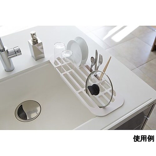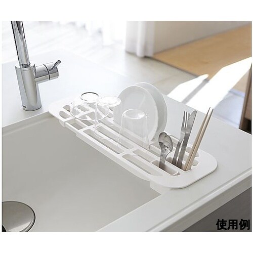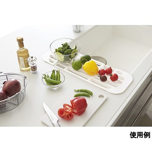 カトラリーポケット2個付伸縮式なので、シンクにぴったり合わせられます。スリットを利用してお皿が立てられます。延長棚として使えば調理スペースが広がります。 |
